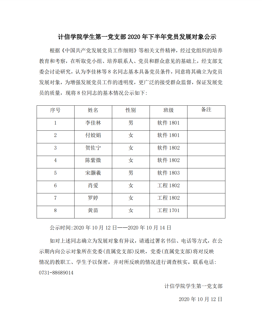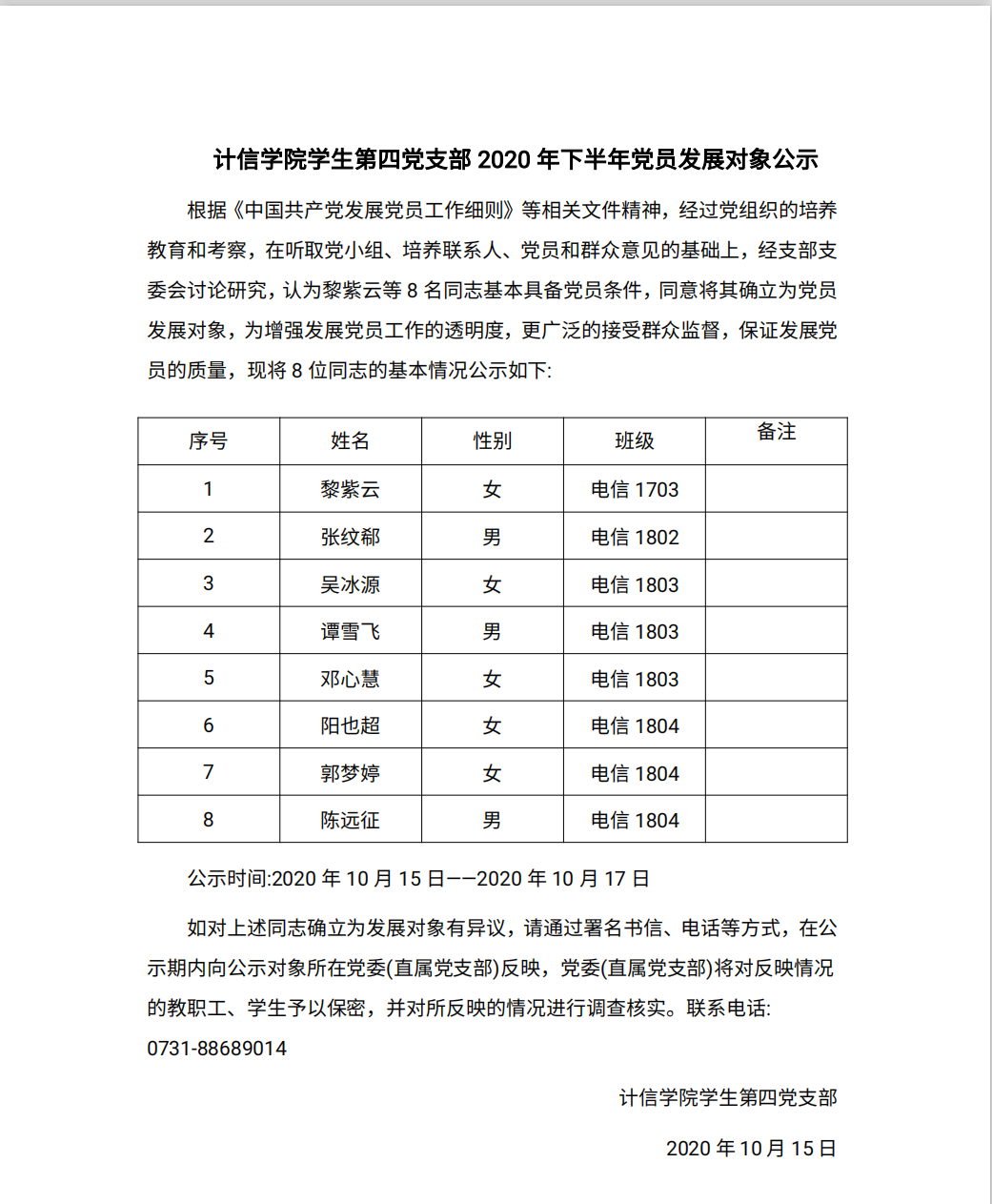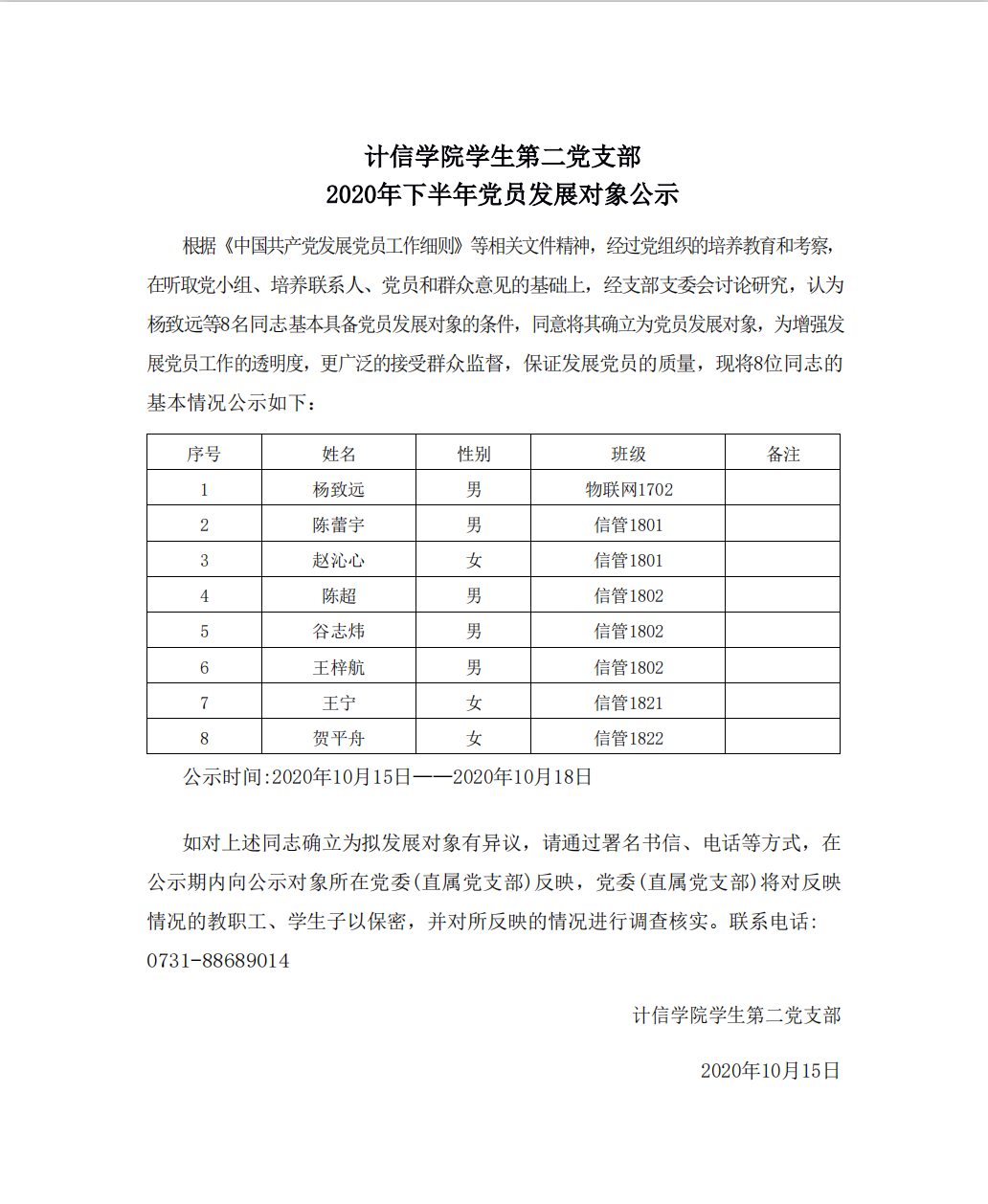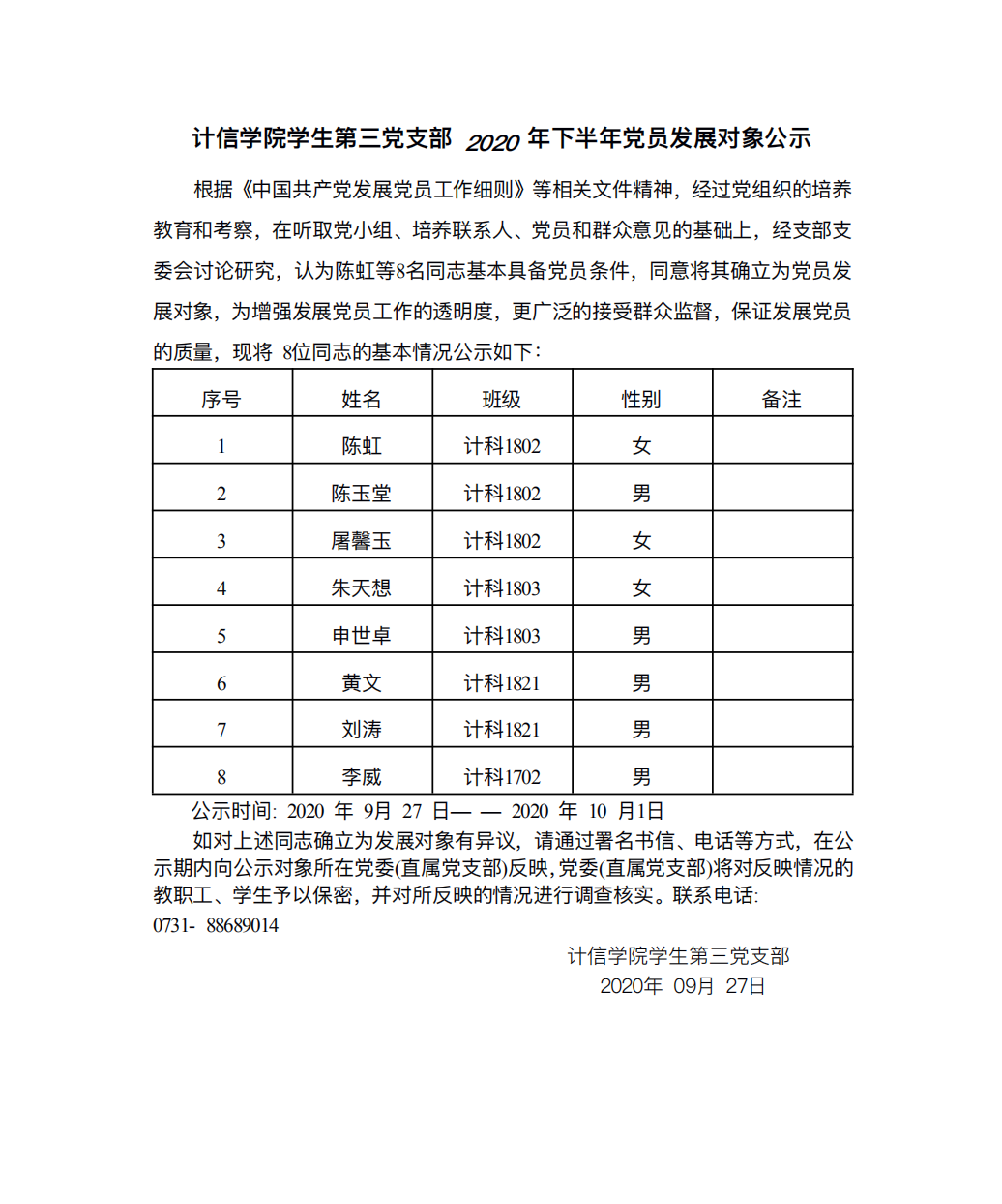 计信学院学生各党支部 2020 年下半年党员发展对象公示