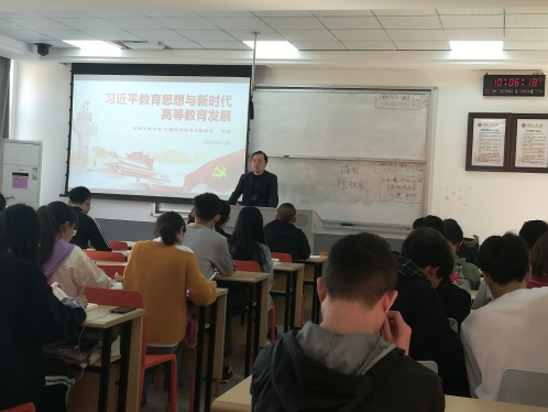 何典老师的讲课内容是《习近平教育思想与新时代高等教育发展》,将习近平总书记提出的教育思想与高等教育结合起来,在如今高等教育飞速发展的时代,要以习近平新时代中国特色社会主义思想为指导,办好人民满意的教育。高校教师要坚持教育者先受教育,努力让自己成为先进思想文化的传播者,认真担负起学生健康成长指导者和引路人的责任。学校需要进一步调动广大师生参与改革的积极性,不断增强学校办校治校的活力。