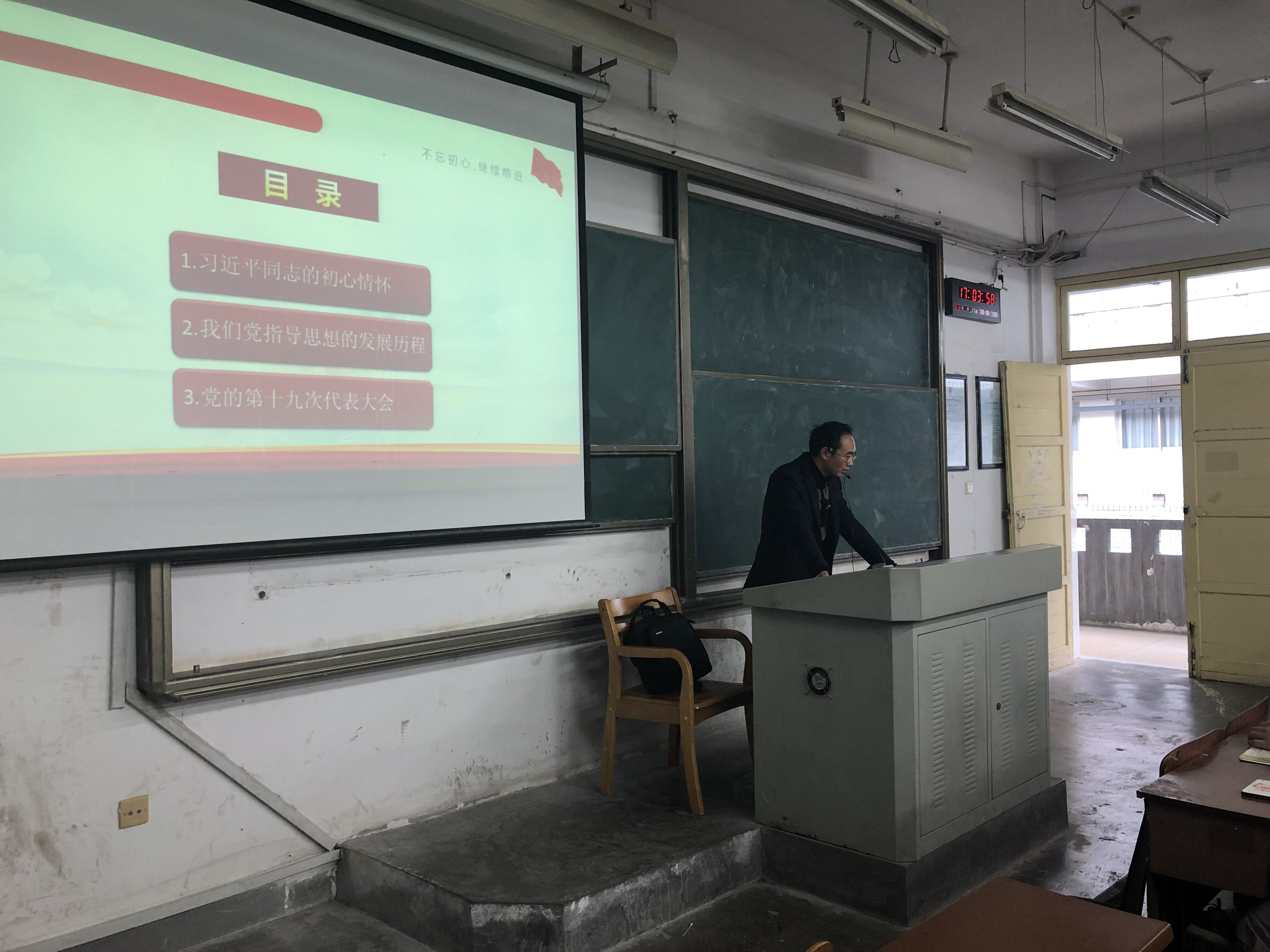 李吉林副书记通过“习近平总书记的初心情怀”、“我们党指导思想发展历程”“党的十九次代表大会”三个主题内容,详细讲述了初心的由来、党的指导思想发展历程、十九次代表大会主要内容。整个党课时间,新发展党员专心听讲,认真做笔记,讲到精彩处同学们积极主动提问,李书记耐心诠释。
