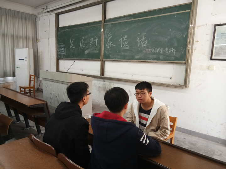 2018年11月5日中午12:30时分,为了进一步了解发展对象的近期思想与生活情况以及对他们进行考察和谈话,我院第一党支部在日新楼D201对他们进行了谈话活动。