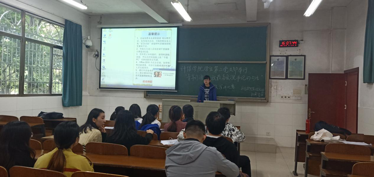 为进一步增强学生党员对党的热爱和了解,2018年10月5日于乐知楼E401教室由计信学院学生第二党支部组织在全体支部党员中开展了“青年–习语——我最喜欢习近平总书记的一句话”的主题微演讲比赛。