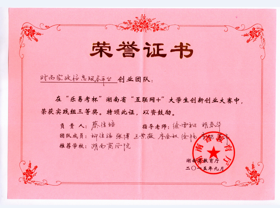 湖南省大学生创新创业大赛三等奖