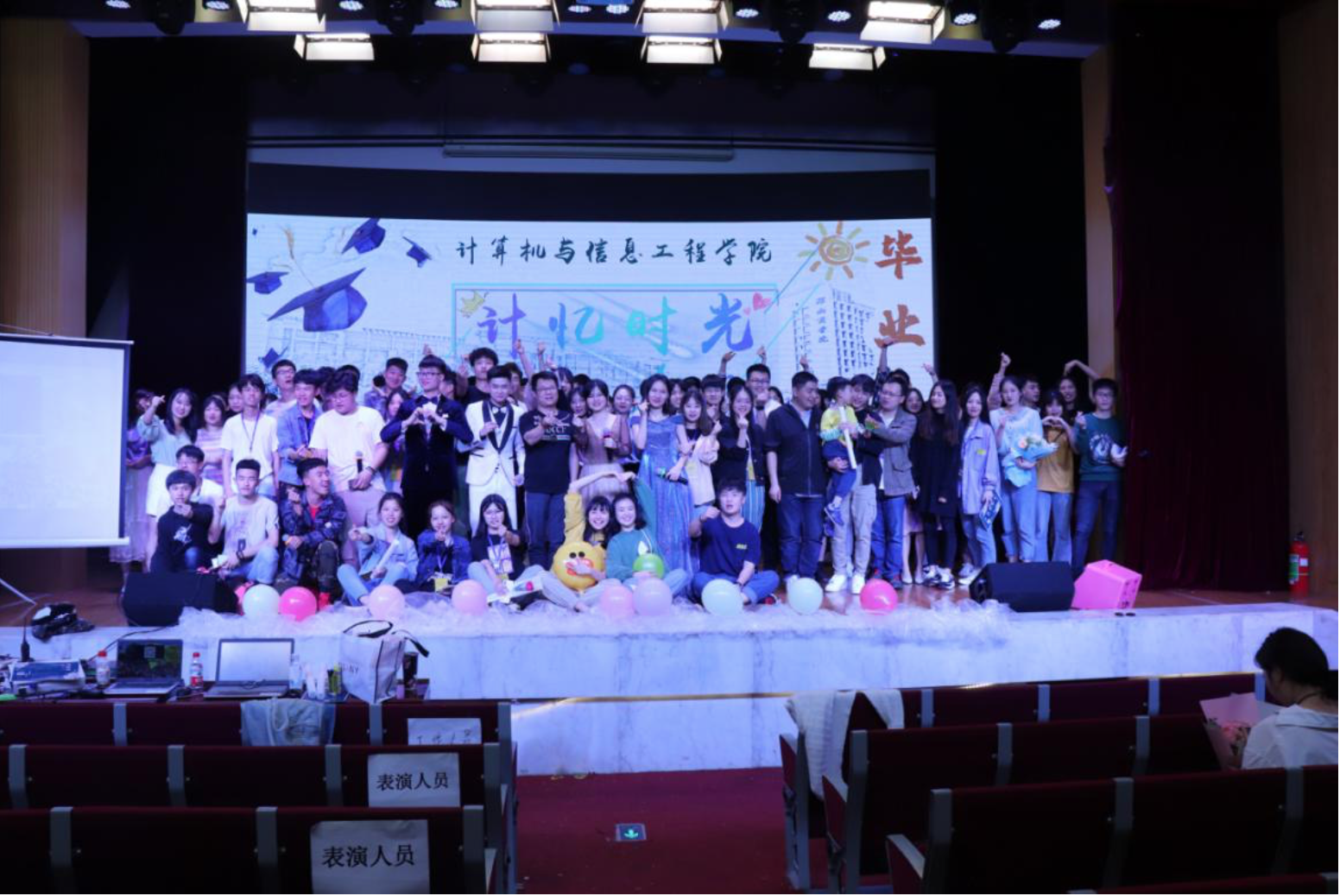 2019年5月17日晚上7点计算机与信息工程学院“计忆时光,信运有你”2019届毕业生晚会在学校大礼堂落下帷幕。 学院分党委余绍黔书记、原分党委李吉林副书记(现任旅管学院分党委书记)、学生管理科曾平科长、招生就业指导中心龚宗明副主任和学办的老师们一起出席晚会,向毕业生们送上美好的祝福和殷切的期望。