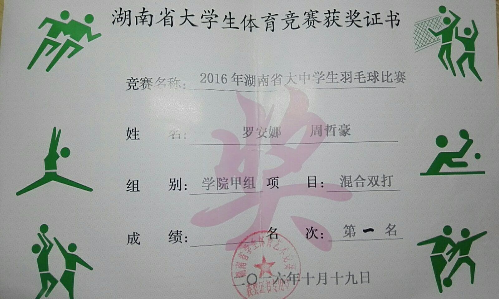 2017年湖南省大学生羽毛球比赛混合双打第一名