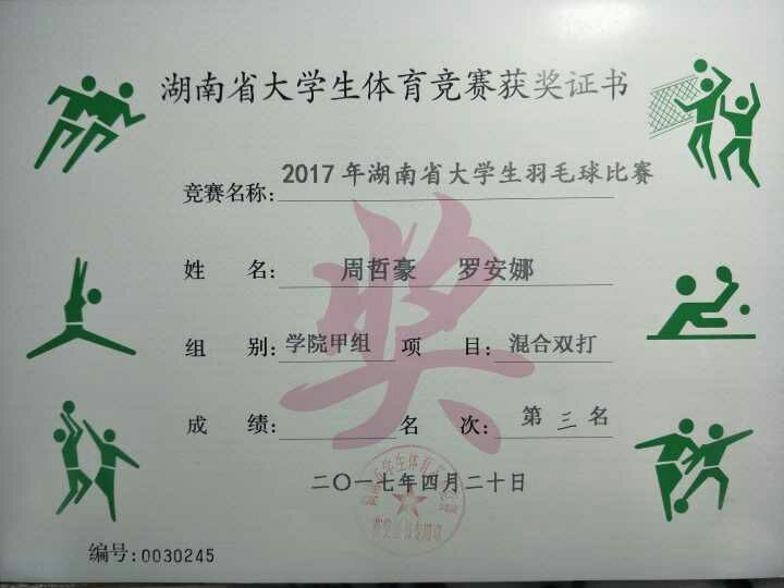 2017年湖南省大学生羽毛球比赛混合双打第三名