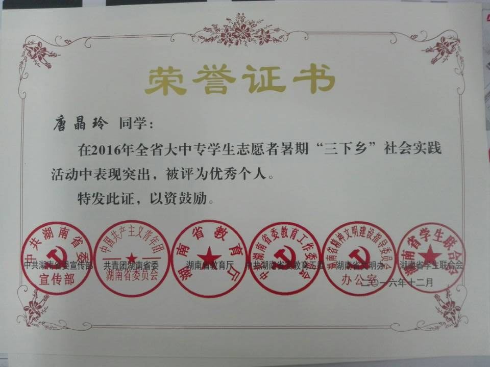 2016年全省大中专学生志愿者暑期“三下乡”社会实践活动优秀个人