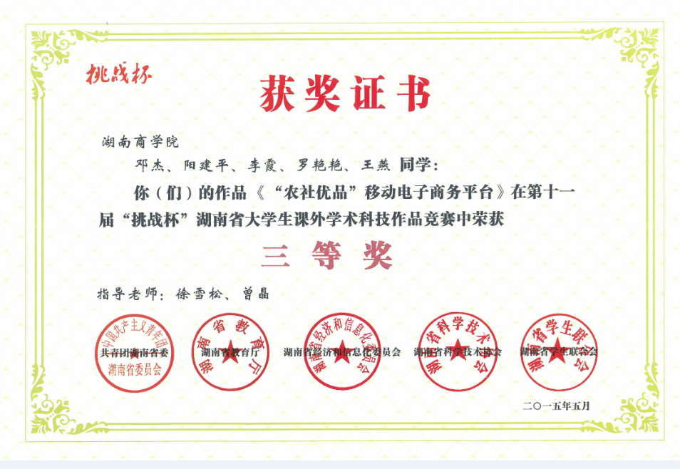 湖南省挑战杯大赛三等奖