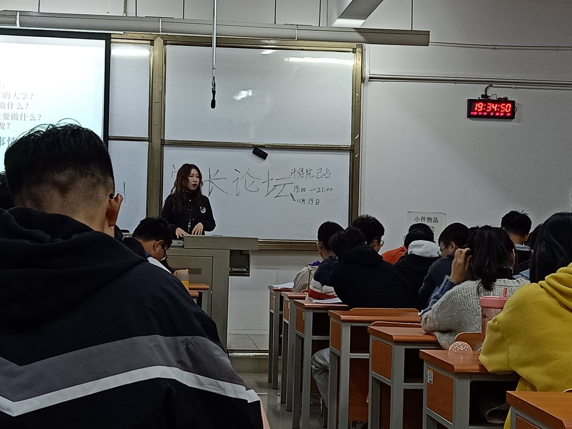 刘惠同学与大家分享了她精彩的大学生活以及学习的方法。首先,刘惠同学作了自我介绍,并且展示了她优异的成绩和所获奖项,包括优秀团员,国家奖学金,校级三好学生等,她连续夺得专业第一,也屡屡获得各种奖项,对此她表示这是努力的结果。随后,她把自己大学的规划的分享给了大家,其中包括了大一大二大三的主要任务分别是学习,提高能力和突破自我,而她也就突破自我讲了以下几个方面:做好党建工作,成为正式党员,参加比赛拿国奖和考驾照。紧接着,她就与大家讲了自己的未来规划——考研,并且告诉大家就业的压力和擅长学习的优势让她选择继续深造来提升她的学历和见识,她的考研目标是985/211大学的本专业的研究生,刘惠同学的坚定目标使大家对未来的目标更加明确。最后,在互动提问的环节中,同学们就自己的学习方面的问题对刘惠同学进行了提问,她也耐心的回答法大家的问题。