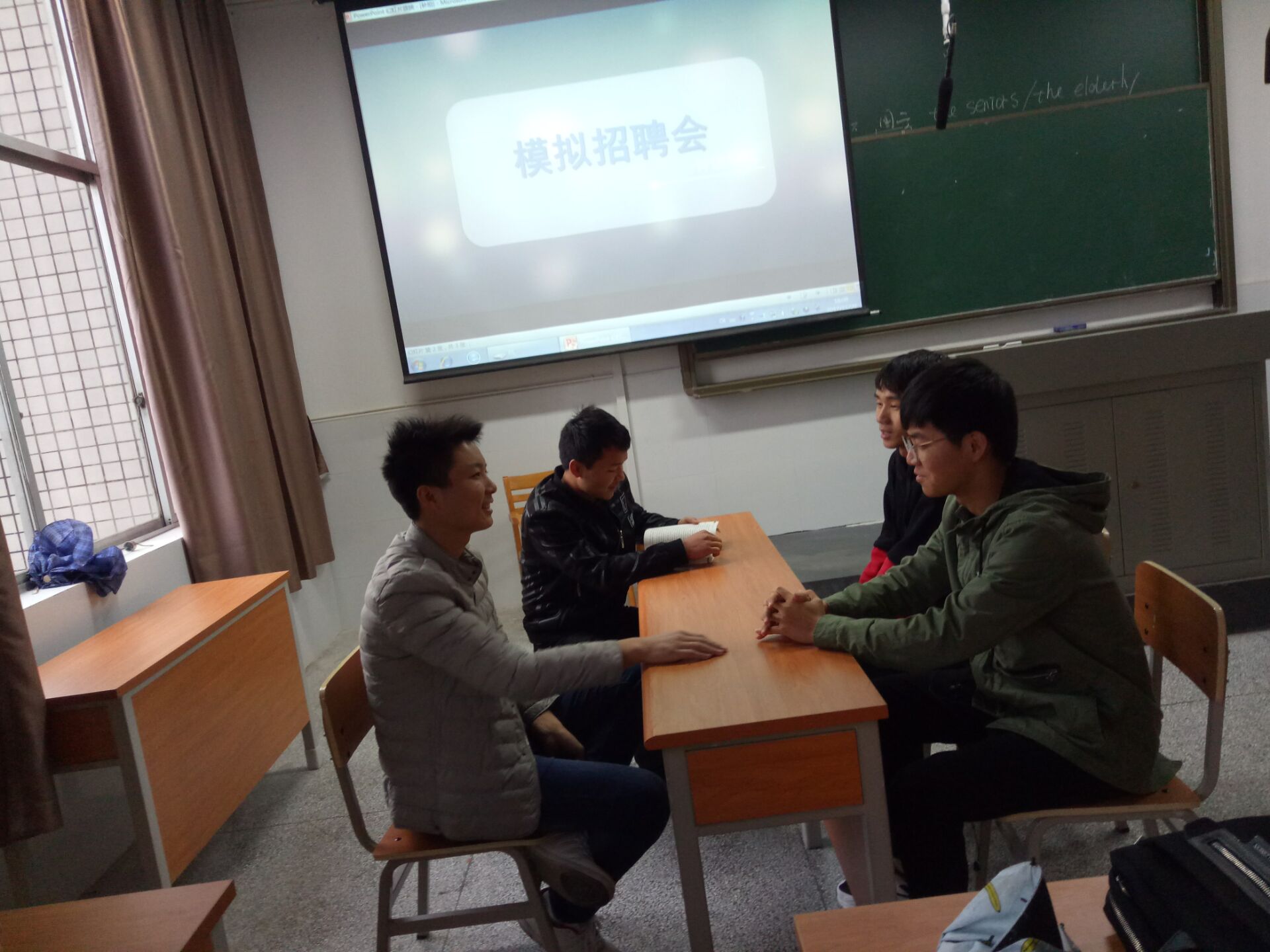 此次活动,我们提前让学生将自己的简历带到现场,然后将学生分为五个小组,自己制作公司的海报,每组自行决定三名学生担任主考官,其他人担任面试者。面试过程中,面试者需进行自我介绍,回答主考官的相关问题。考官们出题严谨新颖,应聘者反应迅速,机智灵敏。活动现场氛围紧张热烈。