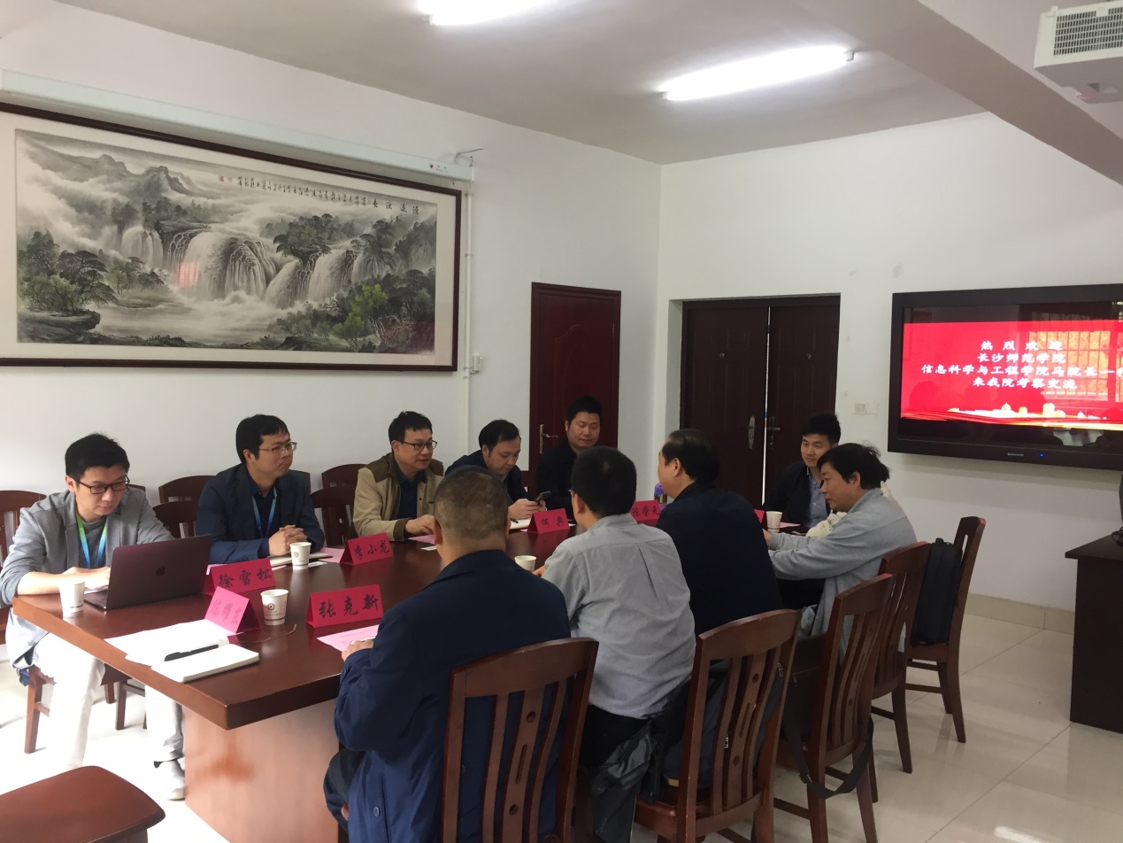 2019年5月8日下午,长沙师范学院信息科学与工程学院马振中院长、李列文主任一行7人来我院进行考察交流。学院党总支书记余绍黔、副院长何典、李小龙和教研室主任陈荣元、徐雪松等,在一办楼321会议室与客人进行了交流。