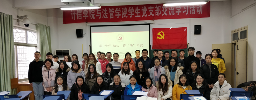 2018年12月7日下午,计信学院学生党支部与法管学院学生党支部于实验楼604教室开展“牢`计`初心,遵`法`严纪”为主题党员交流学习活动。深入学习宪法知识与党员纪律条例,并交流讨论当代大学生党员如何加强法律知识的学习以及提高党员的思想觉悟。